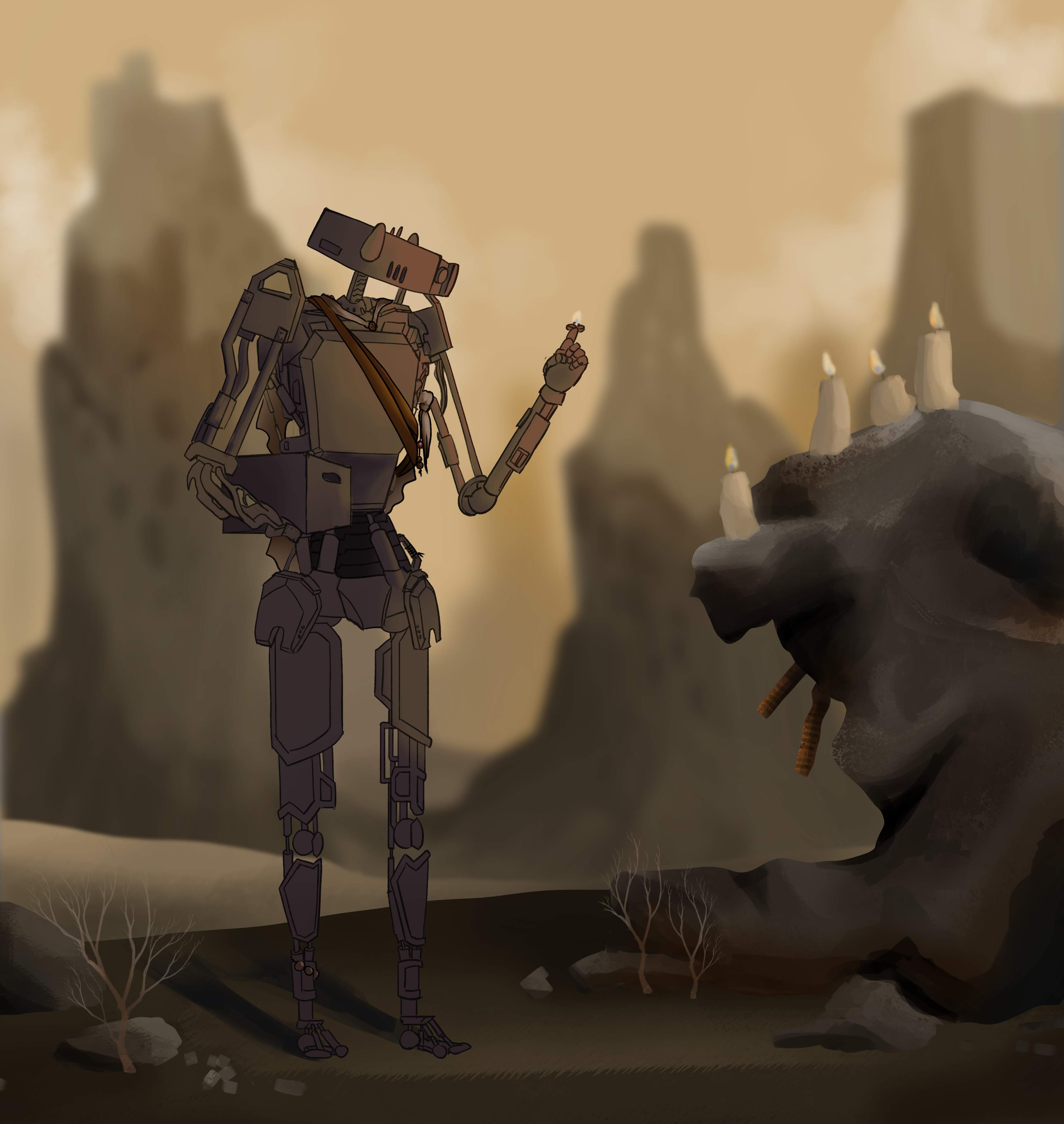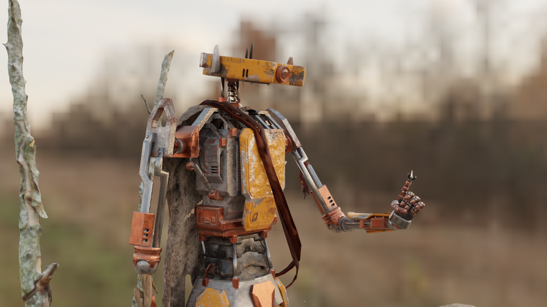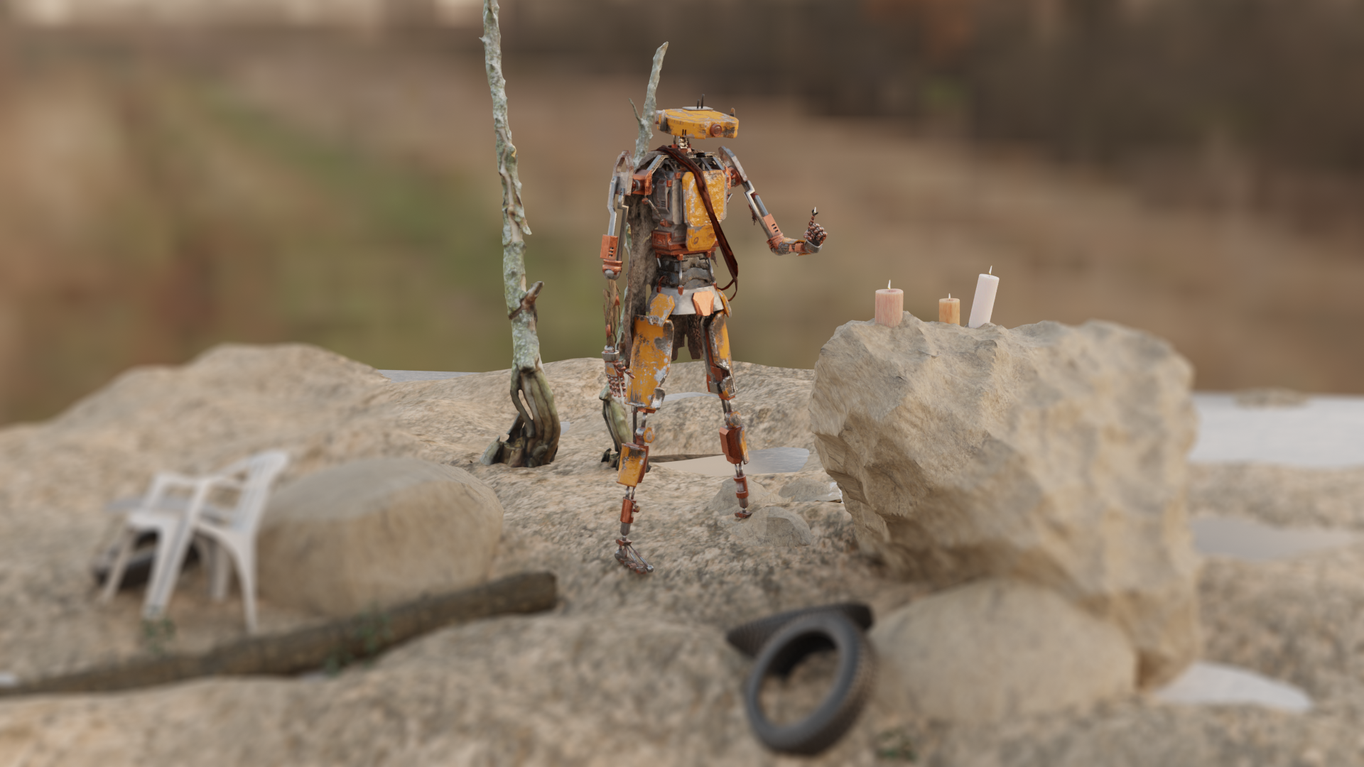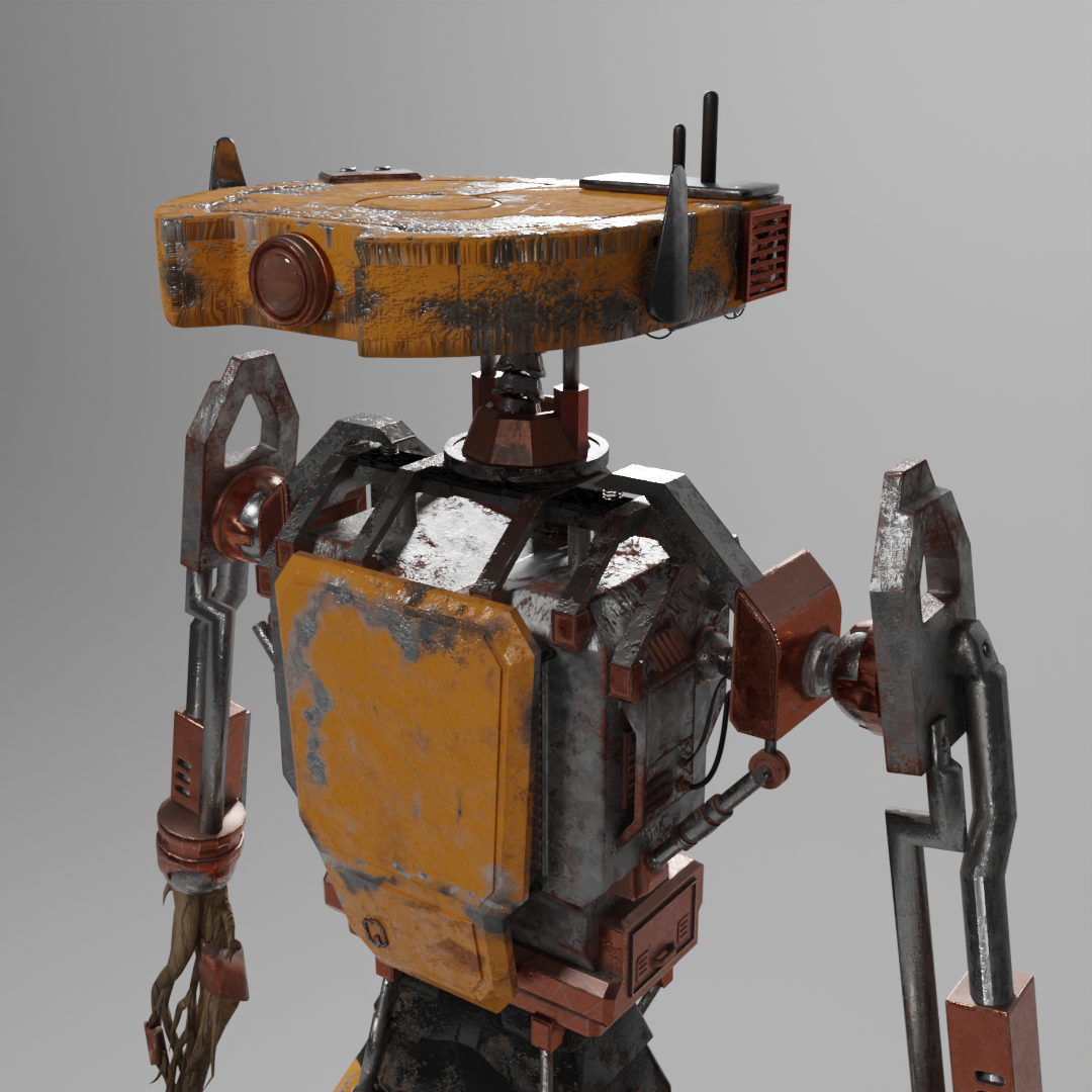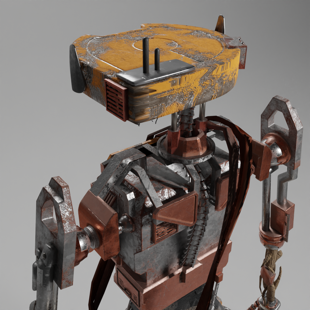 Für den 3D Kurs modellierte und texturierte ich einen Roboter in Blender & Substance Painter. Die Geschichte hinter meinem Roboter ist, dass er durch einen Aufprall auf einen anderen Planeten gekommen ist und in der dortigen postapokalyptischen Welt von einem Stamm aufgenommen wurde.